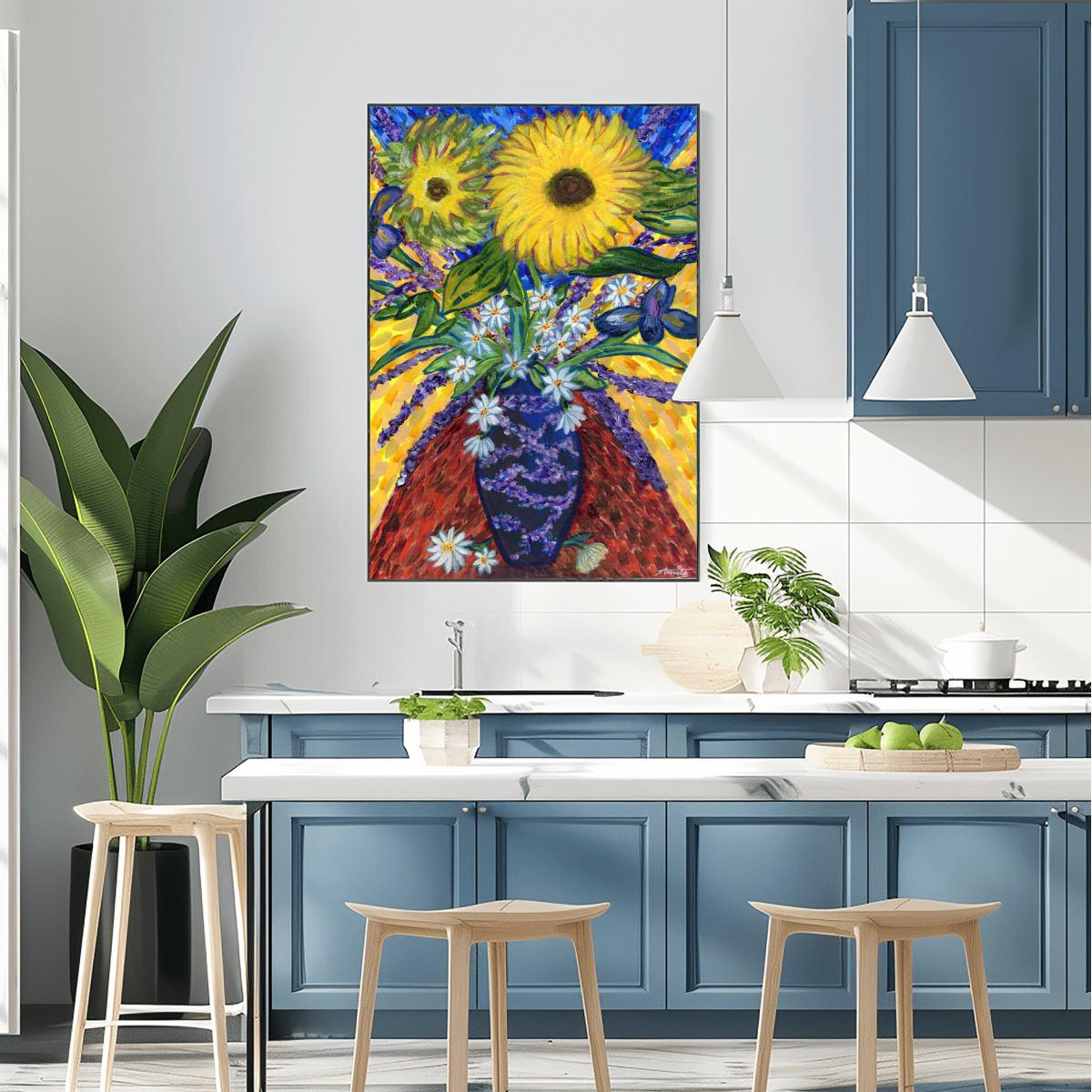 Van Gogh Inspired Sunflower Painting, Iris & Daisy Flowers Artwork, Vase Wall Art Print, Floral Home Decor, Gift for Art Lovers